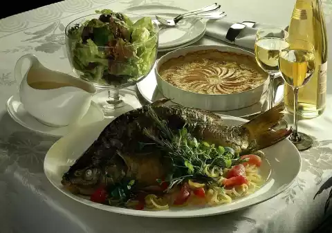Wash the carp thoroughly. Rub vigorously with salt and pepper inside. Place the carp in the fat pan of the oven and pour 30 g of hot fat over them. Wash the herbs and, except for some for garnishing, place them on the fat pan. Pour wine over them and cook in the preheated oven at (electric range: 200 °C/ gas: level 3) for about 45 minutes. Pour the brew in between.