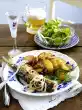 Clean the celery, put the green aside. Wash the celery and dice finely. Clean, wash, shake dry and chop finely. Mix rocket and celery. Cut meat into very thin slices.