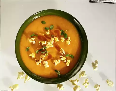 Season to taste with lemon juice, salt and pepper. Peel and chop the garlic. Fry in hot fat. Add popcorn and toss briefly. Divide the soup between four plates. Sprinkle with marjoram leaves and garlic popcorn