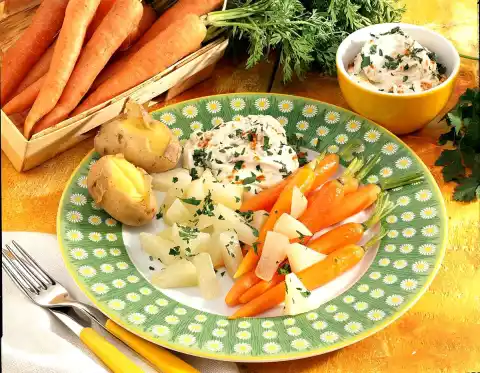 Drain the potatoes and arrange on the plates with the curd sauce. Sprinkle vegetables and quark with the remaining parsley.