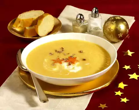 Refine with 100 g whipped cream, season again. Dice ham finely and fry briefly in 10 g butter. Lightly whip the remaining cream. Arrange soup with a blob of whipped cream and diced ham on plates.