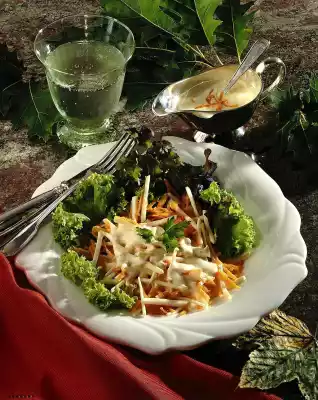 Squeeze orange. Mix salad cream with orange juice and julienne until smooth. Season to taste with salt, pepper and sugar. Mix grated carrots and celery sticks and arrange on plates with the salad leaves.