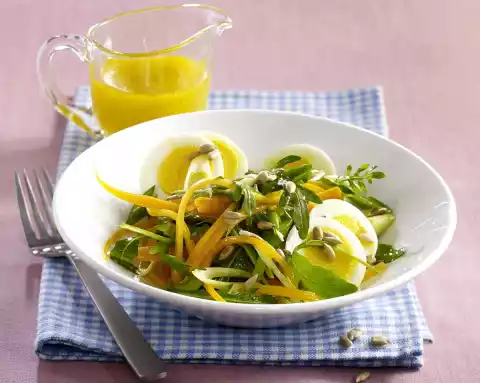 Boil egg in boiling water for about 10 minutes until hard. Peel, wash and cut carrots into strips. Roast sunflower seeds in a pan without fat for about 2 minutes, remove. Bring orange juice to the boil, add carrots and stew in the juice for about 3 minutes.