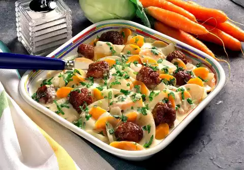 Peel and wash the carrots and kohlrabi. Quarter the kohlrabi. Cut the vegetables into slices. Boil 1/2 litre water and broth. Add vegetables and cook for about 10 minutes. Heat oil in a pan and fry the meatballs for about 10 minutes, turning occasionally.