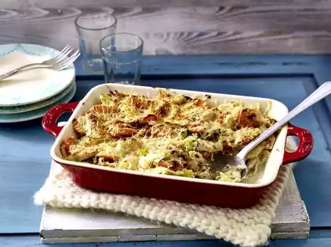 Grate cheese finely and mix with breadcrumbs. Mix the meat, vegetables and noodles together and place in an ovenproof dish (approx. 17 x 27 cm). Sprinkle the cheese-crumbs mixture over it and bake in a preheated oven (electric cooker: 175 °C/ convection oven: 150 °C/ gas: see