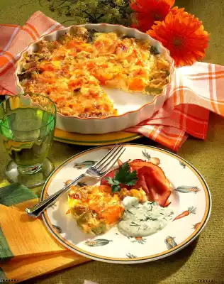 Cut the carrots into slices. Cook in boiling salted water for about 7 minutes, place on a sieve and drain. Cut leek into rings. Layer the vegetables in a flat, ovenproof dish. Whisk sour cream, milk and egg, season with salt, pepper and nutmeg. Spread over the gratin.