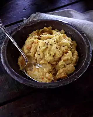 Drain the vegetables. Add milk, caraway butter and remaining butter and mash. Season puree with salt and nutmeg