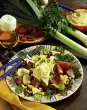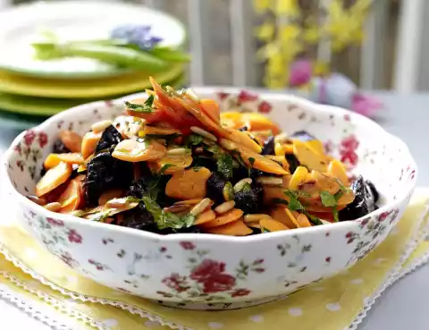 Season with salt, pepper, some sugar and 1/2 tsp. cumin and ##cinnamon## each. Fill into a bowl and let it cool down. Roast pine nuts in a pan without fat until golden brown, take them out and let them cool down. Fold the pine nuts into the salad. Season the salad with salt, pepper, sugar, cinnamon and cumin and serve