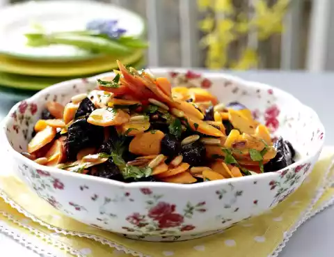 Roast the pine nuts in a pan without fat until golden brown and take them out. Heat the oil in the pan. Sauté the carrots for 3-4 minutes. Fold in plums. Deglaze everything with orange juice, bring to the boil and simmer for 5 minutes.