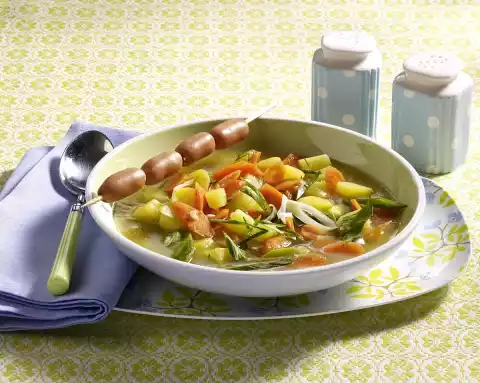 Add the remaining potatoes and carrots and cook for about 8 minutes until firm to the bite. Add spring onions and continue cooking for about 2 minutes. Season soup with salt, pepper, sugar and a dash of vinegar. Put 4 sausages lengthwise on each skewer and add to the soup.