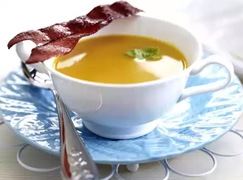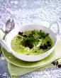 Remove from the pan. Remove the soup from the hotplate, puree it with a blender and pass it through a fine sieve. Stir in crème fraiche. Season again with salt, pepper and nutmeg. Fill the soup into small bowls and garnish with basil.
