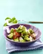Season with salt and pepper. Deglaze with broth, bring to the boil, cover and cook for about 25 minutes. In the meantime cut ham lengthwise in half. Heat 1 tablespoon of oil in a frying pan, fry ham slices 1/2-1 minute on each side.