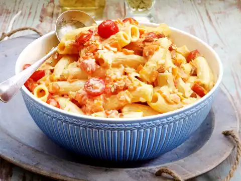Meanwhile cook the noodles in boiling water according to the instructions on the packet. Grate the parmesan. Roughly chop the almonds. Take off about 100 ml of pasta water. Drain the pasta and put it back into the pot. Mix with carrot-tomato sauce, pasta water and parmesan.