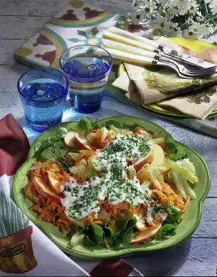 Mix mayonnaise, yoghurt, vinegar and pineapple juice and season to taste with salt, pepper and sugar. Mix the carrots, celery and apples and arrange on a plate covered with lettuce leaves.