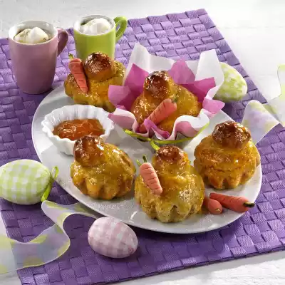 Press the small balls into the middle. Spread the brioches with whisked egg yolk. Bake in the preheated oven (electric cooker: 175 °C/ convection oven: 150 °C/ gas: level 2) for about 20 minutes. If necessary, cover with baking paper for the last 10 minutes. Remove the brioches from the baking tins and let them cool on a cake rack. Serve with apricot jam