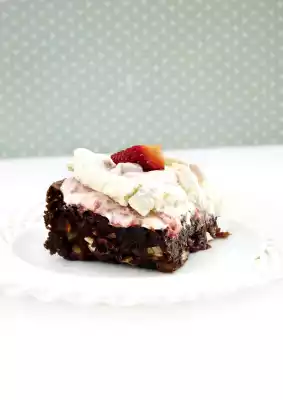 Wash, clean and dice the strawberries, except for about 100 g for decoration. Sprinkle with 2 tablespoons of sugar and let it stand for a short time. Whip the crème fraîche and 2 tbsp. sugar with the whisk of the hand mixer. Lightly mush the strawberries with a fork, add to the crème fraîche and fold in. Spread to about 1/4 of the finished brownie. Cover the brownie with broken meringue and sprinkle with the remaining crème fraiche. Cut into pieces and carefully remove from the mould. Decorate with remaining strawberries