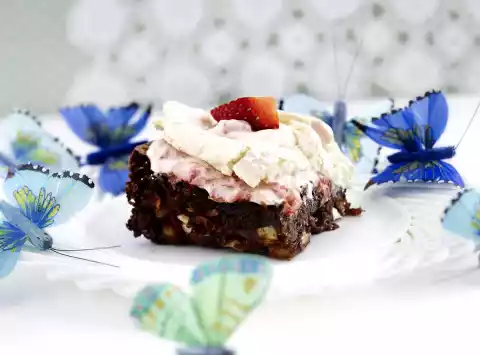 Break the meringue into pieces and spread on top. Cut the brownie into pieces and remove from the mould piece by piece. Spread the rest of the strawberry cream in patches. Decorate with the remaining strawberries.