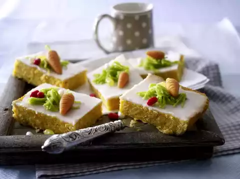 Form carrot green from some green marzipan and stick it to the carrots. For the icing, stir 350 g icing sugar and 6-8 tbsp lemon juice until smooth. Spread evenly on the cake and leave to dry.