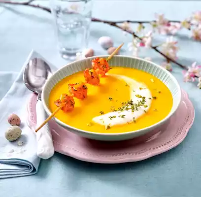 Take the soup from the stove and puree it. Season to taste with salt and pepper. Warm the milk and foam it up with a blender (or whisk). Chop the pistachios. Arrange the soup and one prawn skewer each. Put some milk foam on the soup and sprinkle with chopped pistachios. With the rest of the thyme garnish