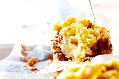 For the filling, mix cream cheese, 50 g sugar, 1 egg, 2 tablespoons lemon juice and starch. For the crumbles, knead 150 g almonds, 75 g sugar and 100 g cold butter in pieces to form coarse crumbles. Mix in the remaining grated carrots.