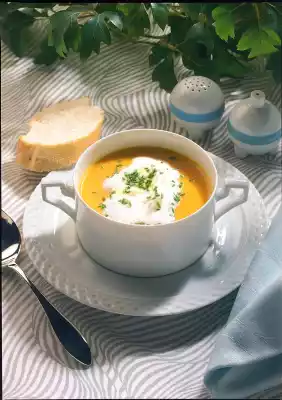 Add vegetable stock. Add carrots and tomatoes and cook for 15-20 minutes. In the meantime, whip 100 g cream until stiff. Wash the chives and cut into fine rolls. Puree the vegetables in the stock. Refine with remaining cream and season with salt and pepper.