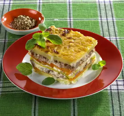 Layer 1 part of the potato slices, spread some sauce on it, place half of the carrot strips on top, spread some sauce on top. Cover with half of the leek, put sauce on top again and layer half of the minced meat. Repeat and finish with potatoes and sauce. Sprinkle the rest of the Gouda on top. Bake in the preheated oven (electric cooker: 200 °C/ convection oven: 175 °C/ gas: level 3) for about 30 minutes. Cut into pieces, arrange on plates and serve garnished with remaining marjoram