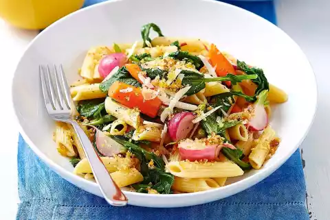 Cook the pasta in salted water according to the instructions on the packet. Heat the oil. Fry the radishes and carrots for about 5 minutes. Add garlic and radish greens, fry for about 2 minutes and season.