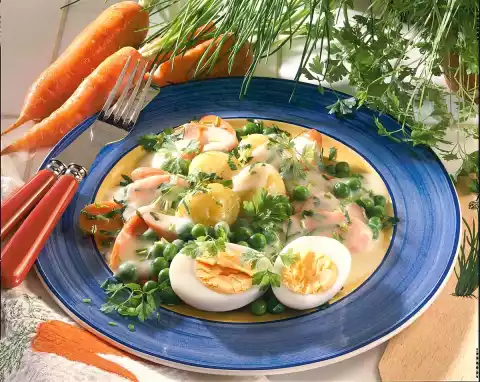 Wash the potatoes and cook covered with water for 20 minutes. Boil the egg hard for 8-10 minutes. Peel, wash and slice the carrots. Peel and finely dice the onion and fry in the fat until translucent. Add the carrots and steam briefly. Add stock, bring to the boil and cook for about 5 minutes. Add peas.