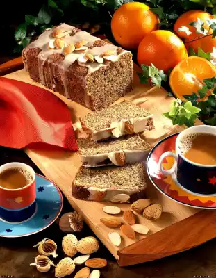 Mix flour and baking powder, alternating with the beaten egg whites and stir into the dough. Pour the dough into a greased box form (25 cm long; 1.5 l capacity). Bake in a hot oven (electric cooker: 175 ° C / gas: level 2) for 50-55 minutes. Halve whole almonds. Mix 60 g fruit sugar and 10 ml juice. Pour pour over the dough. Decorate with almonds