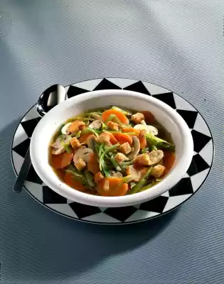 Steam vegetables in hot fat and add broth. Cook for about 10 minutes and season with pepper and nutmeg. Dice toast and brown with a dry pan. Sprinkle over the stew