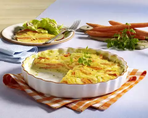 Mix chervil, condensed milk, cream and 100 ml broth and season with salt, pepper and nutmeg. Layer carrots and potatoes in a greased casserole dish and pour over the liquid. Grate the cheese and sprinkle over it.