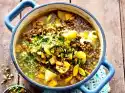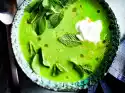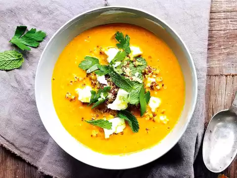 Wash and pluck the herbs. Add lemon peel, lemon juice and half of the cheese to the soup, puree. Season with salt and pepper. Serve with quinoa, rest of cheese and herbs. Serve with flatbread.