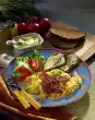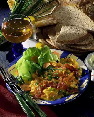 Mix eggs, milk, 3 tablespoons water, salt, pepper and nutmeg. Leave bacon in a pan until crispy and take it out. Put fat into the hot pan, briefly sauté grated carrots and pour on egg milk. Let it falter at low heat, while pushing the egg together. Spread the scrambled eggs and bacon on plates. Sprinkle with chives and serve garnished. Serve with a hearty mixed bread