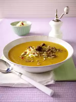 Take the soup off the stove, puree it. Season to taste with salt and pepper. Serve with a dollop of apple-horseradish cream, sprinkle with croutons and seeds. Add the rest of the horseradish cream.