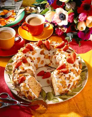 Beat the egg whites until stiff, add the remaining sugar. Fold the beaten egg whites in two portions under the dough and put them into a greased Savar form (approx. 25 cm Ø/ approx. 2 1/4 litres capacity) sprinkled with breadcrumbs and smooth it down. Bake in the preheated oven (electric oven: 200°C/ gas: level 3) for 40 to 50 minutes (cover if necessary in the last five to ten minutes). Let the carrot wreath rest in the pan for 10 to 15 minutes, then turn out of the pan and let it cool down. In the meantime, roast the flaked almonds in a pan without fat and let them cool down as well. Sift icing sugar onto the marzipan and knead. Colour the marzipan orange with yellow and red food colouring and form 16 small carrots. Halve or quarter the pistachios and put them into the carrots as leafy greens. Whip cream, crème fraîche, sugar and vanilla sugar until stiff. Spread the wreath all around and sprinkle with flaked almonds.