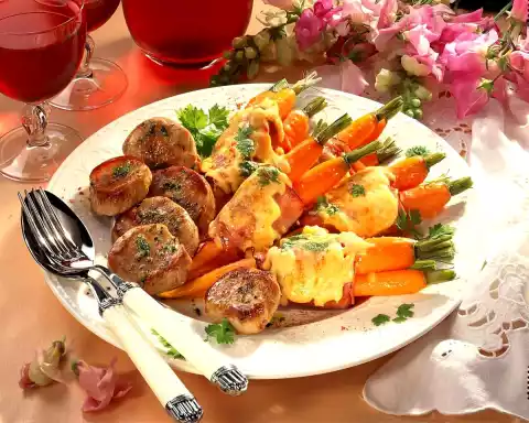 Clean and wash the carrots and cook them in boiling salted water for about 15 minutes. In the meantime cut the ham slices in half. Wash pork thoroughly and cut into slices of about 2 cm thickness. Remove the carrots from the water, quench and wrap 3-4 carrots with 1/2 slice of boiled ham around each, place on a baking tray lined with baking paper and sprinkle with cheese. Bake the carrots in a preheated oven (electric cooker: 200°C/ gas: level 3) for about 12 minutes. In the meantime heat oil in a pan, fry pork medallions in it at medium heat on each side for about 3 minutes, season with salt and pepper. Serve carrots and pork medallions garnished with melted herb butter and chervil as desired