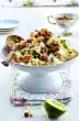 Pour 250 ml of boiling salted water over the couscous. Cover and let it swell for about 10 minutes. In the meantime, wash mint, shake dry and pluck leaves from the stalks. Roast the pistachios in a pan without fat, remove.