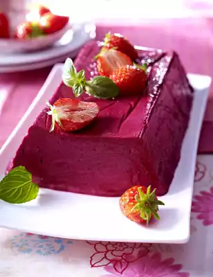 Whip the cream until stiff and carefully fold into the currant mixture. Pour into an oiled, foil-lined box form (500 ml capacity, 15 cm long, 8 cm wide). Cover and chill for approx. 12 hours. Wash and halve the strawberries. Wash mint, shake dry, pluck leaves from the stalks. Remove the cassis cream from the tin and decorate with strawberries and mint