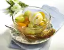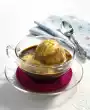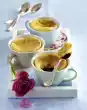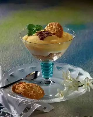 Stir the egg whites into the cream and bring to the boil. Spread the cream on the soaked pastry. Mix egg yolks, remaining cream powder, sugar and remaining wine in a pot and bring to the boil while beating vigorously with a whisk. Allow the sauce to cool, stir from time to time and pour over the cream. Serve the dessert with the rest of the pastry, decorated with lemon balm and chocolate shavings as desired
