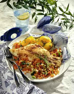 Wash the chives, rub dry and cut into small rolls. Sprinkle over the potatoes. Arrange fish fillet with lentil vegetables and potatoes on plates.