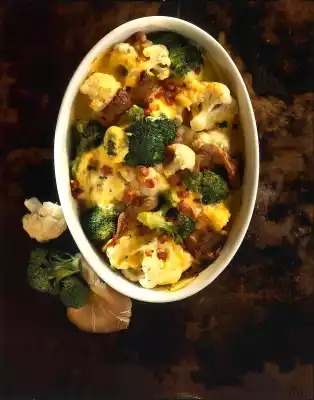 Stir in milk and cooking water bit by bit. Season sauce with salt, pepper and nutmeg and let it swell for 5 minutes at low heat. Grate cheese and stir in. Put bacon, mushrooms, broccoli and cauliflower in an ovenproof dish. Add cheese sauce. Bake in a preheated oven (electric cooker: 200 °C/ gas: level 3) for 25-30 minutes