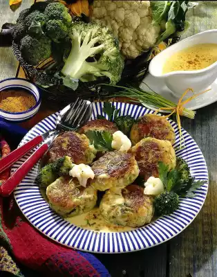 Press through a potato press. Stir in flour and egg. Season with salt, pepper and nutmeg. Drain vegetables and let them drain well. Divide 450 g into very fine florets and add to the potato mixture, knead carefully. Shape the mixture into 12 roasts and fry in hot oil on both sides for 8-10 minutes, turning. For the sauce, peel and finely dice the onion. Fry in hot fat until translucent. Sprinkle with flour and curry and sauté. Add stock and cream bit by bit while stirring.