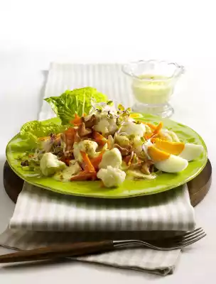 Boil the eggs in boiling water for about 10 minutes until hard, rinse and peel them. Clean and wash the cauliflower and divide it into florets. Blanch briefly in boiling salted water. Drain and let drain. Peel and wash the carrots and cut them into fine sticks.