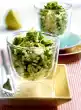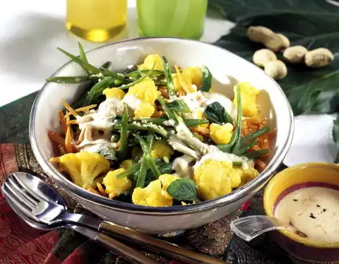 Add 1 tablespoon curry to the boiling water and cook the cauliflower for 6-8 minutes. In the meantime, peel and finely chop the shallot and garlic. Chilli pepper also finely chop. Stir the peanut cream, coconut milk, crème fraîche and shallots mixture until smooth. Season with remaining curry, salt, pepper, vinegar and lemon juice. Stir in the oil bit by bit. Season sauce again. Remove the cauliflower and drain. Mix the prepared vegetables with the salad dressing and leave to stand for about 10 minutes. Meanwhile roast sesame seeds in a hot pan until golden, take them out and let them cool down.