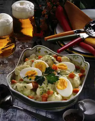 Let it boil for 1 minute. Add crème fraîche and half the herbs to the sauce. Season with salt and pepper and warm the vegetables in the hot sauce. Peel and halve the eggs. Put the ragout in a bowl and arrange the eggs on top. Sprinkle with remaining herbs and serve garnished. Boiled potatoes taste good with it