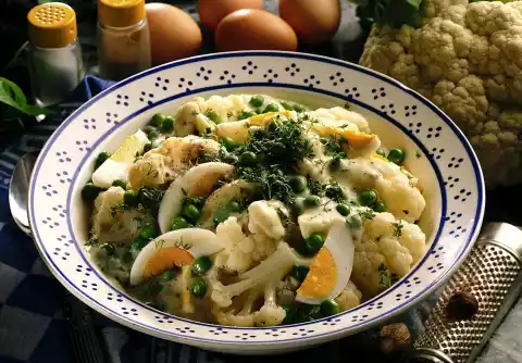Clean and wash the cauliflower and divide it into florets. Cook in 3/4 litres of boiling salted water for about 15 minutes. Meanwhile hard-boil the eggs in about 10 minutes. Drain the cauliflower. Collect the liquid.