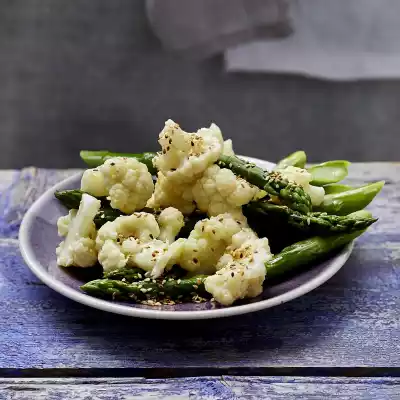 Heat butter in a pan and roast sesame seeds briefly in it. Toss the asparagus and cauliflower in it. Season with salt.