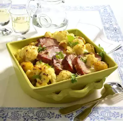 Cook the cauliflower for about 8 minutes. Drain and store the stock. Peel and finely chop the onion. Melt butter, sauté onion in it. Dust with flour. Add 350 ml cauliflower stock and cream while stirring, bring to the boil. Grate cheese and melt in the sauce. Season to taste with salt, pepper and nutmeg. Fry potatoes in hot oil for about 5 minutes. Cut the slices of Kasseler into finger-thick slices. Fill vegetables, potatoes, sauce and pork loin into an ovenproof dish. Bake in the preheated oven (electric cooker: 200 °C/ convection oven: 175 °C/ gas: level 3) for about 20 minutes.