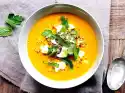 Take the chickpeas out of the oven and let them cool down a little. Pour cream into the soup, bring to the boil and then puree finely. Season to taste with salt and pepper. Serve with coriander pesto and half the chickpeas. The rest of the chickpeas are delicious to nibble on - best kept in a tin.