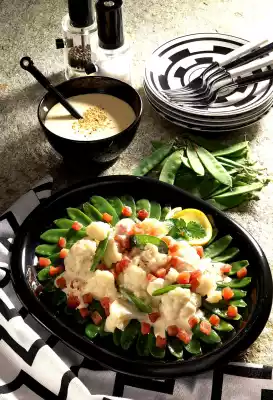 Clean and wash the cauliflower, divide into florets and cook in boiling salted water for about 15 minutes. In the meantime, wash the sugar peas, cut off the ends and add the pods to the cauliflower 2 minutes before the end of the cooking time. Drain the vegetables and rinse them in cold water. Let the vegetables cool down. Roast the sesame seeds in a dry pan. Mix mayonnaise with egg yolk, lemon juice, milk, sugar and 1 tablespoon sesame. Season to taste with salt and pepper. Arrange the vegetables on a plate. Add some dressing. Add the rest of the dressing and sprinkle both with the rest of the sesame seeds